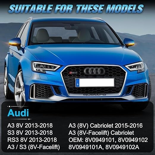 Modele kompatybilne: Audi A3 8 V 2013-2018, S3 8 V 2013-2018, RS3 8 V 2013-2018, A3/S3 (8 V-Facelift), A3 (8 V) Cabriolet 2015-2016, A3 (8 V-FF) facelift) kabriolet. OEM: 8V0949101, 8V0949102, 8V0949101A, 8V0949102A. 1 zestaw = 2 sztuki. Wbudowany kontroler CANbus, bez błędów. 33 łatki SMD 4014 wysokiej jakości. Plug & Play, niepolaryzacja, łatwość instalacji.