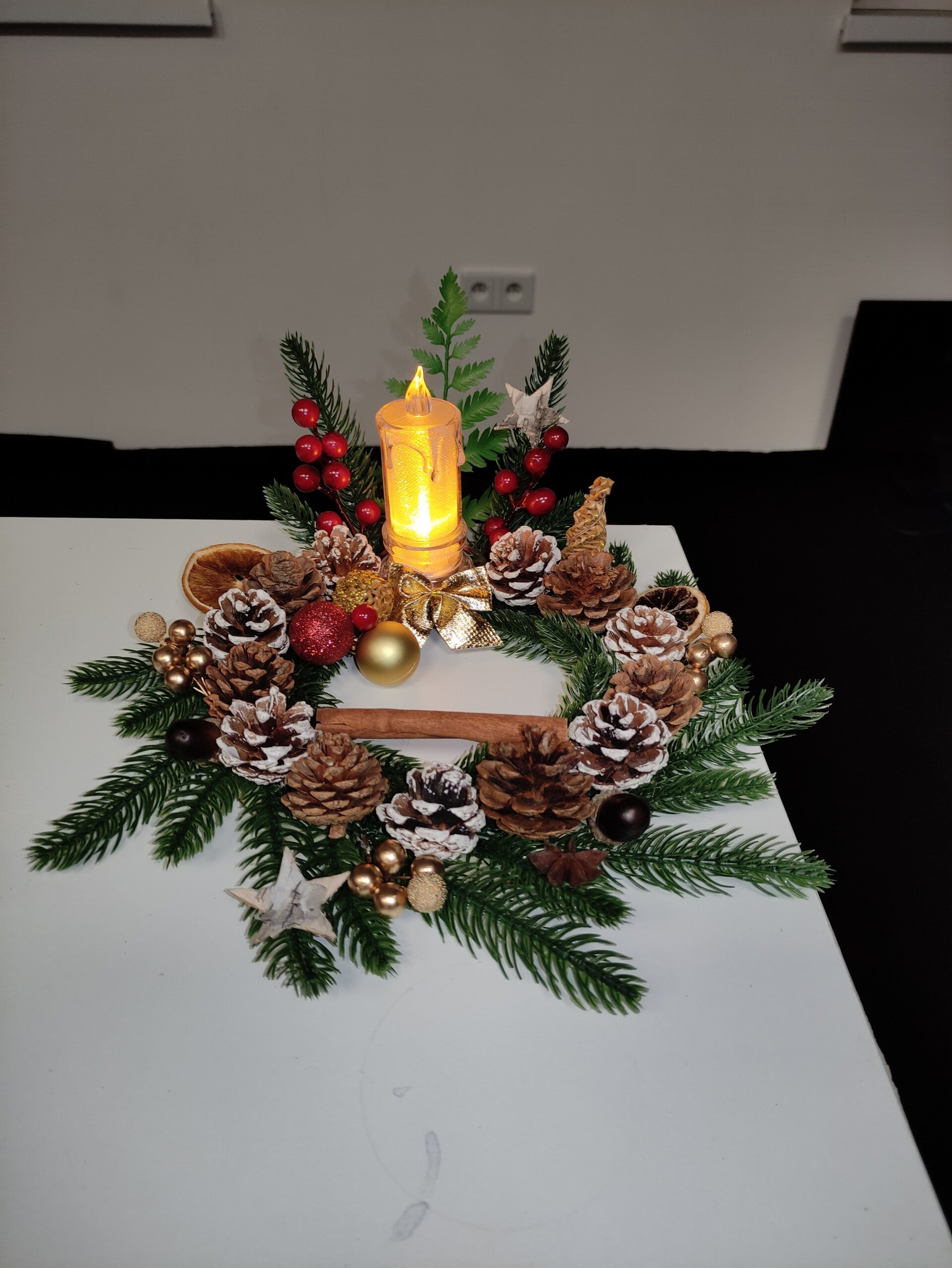 Stroik świąteczny wykonany ze sztucznych dodatków i suszu w komplecie ze świecą ledową. Średnica stroika około 23 cm.